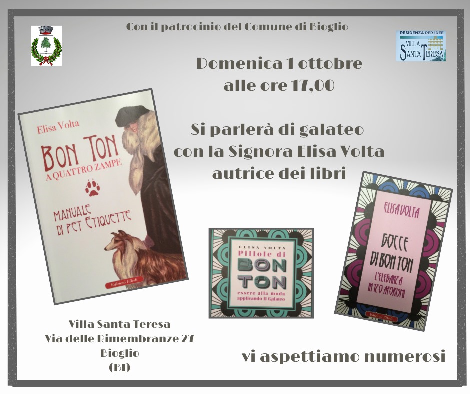 Domenica 1 ottobre nella meraviglilosa cornice della Villa Santa Teresa ELISA VOLTA, autrice di testi sul bon ton presenterà: