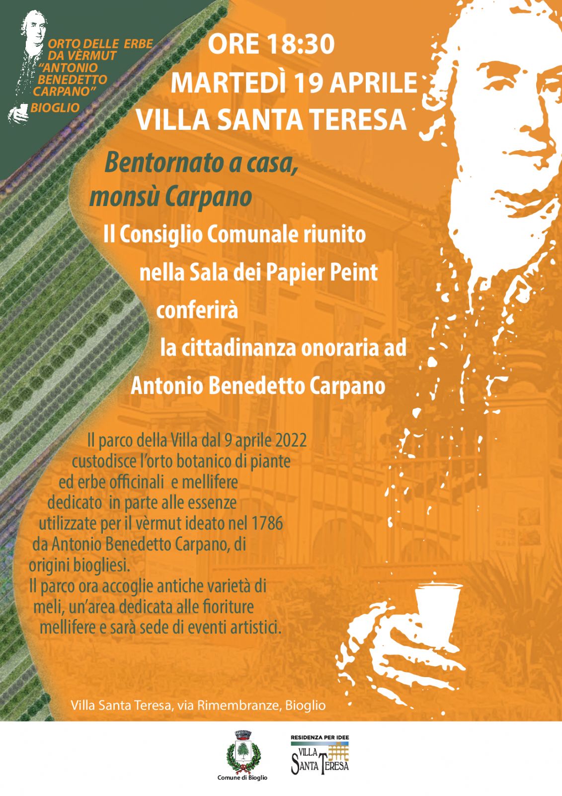 Martedì 19 aprile alle ore 18,30 presso la sala dei Papier Peint nella Villa Santa Teresa si terrà il consiglio comunale con all'ordine del giorno il conferimento della cittadinanza onoraria ad Antonio Benedetto Carpano padre del Vermut