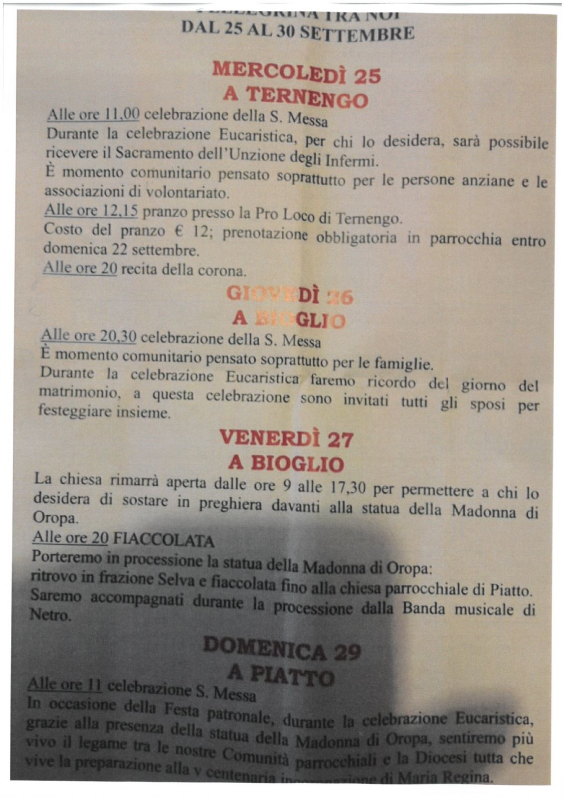 In occasione dell'anniversario della quinta centenaria incoronazione della Madonna di Oropa la sacra effige giungerà a Bioglio. La Parrocchia diffonde il programma allegato affinché la cittadinanza sia adeguatamente informata.