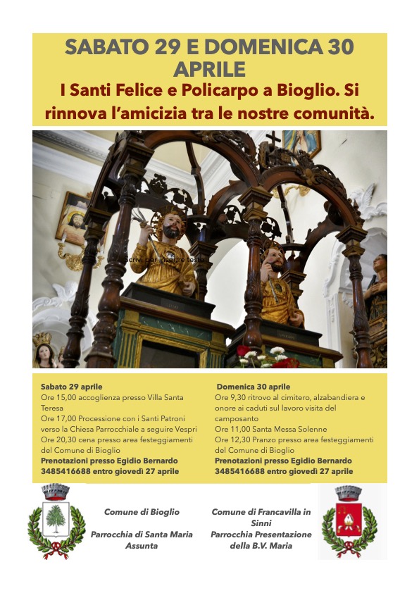 Sabato 29 aprile e domenica 30 aprile la comunità di Francavilla In Sinni sarà presente a Bioglio per rinnovare il rapporto di amicizia che lega le nostre comunità.