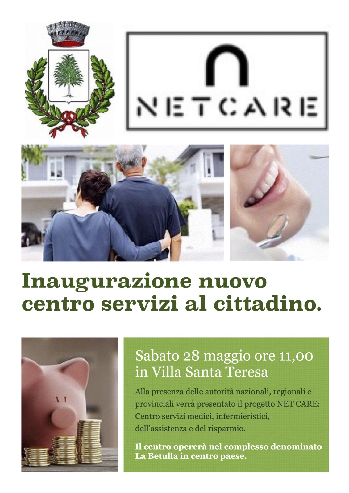 L’evento si svolgerà il giorno sabato 28/05/2022 alle ore 11,00 presso VILLA S. TERESA in Via delle Rimembranze a Bioglio e sarà l’occasione per presentare la carta dei servizi con gli spazi ambulatoriali e gli sportelli al cittadino affidati alla Rete di Impresa NET CARE e messi a disposizione dal Comune di Bioglio tramite aggiudicazione di bando comunale.