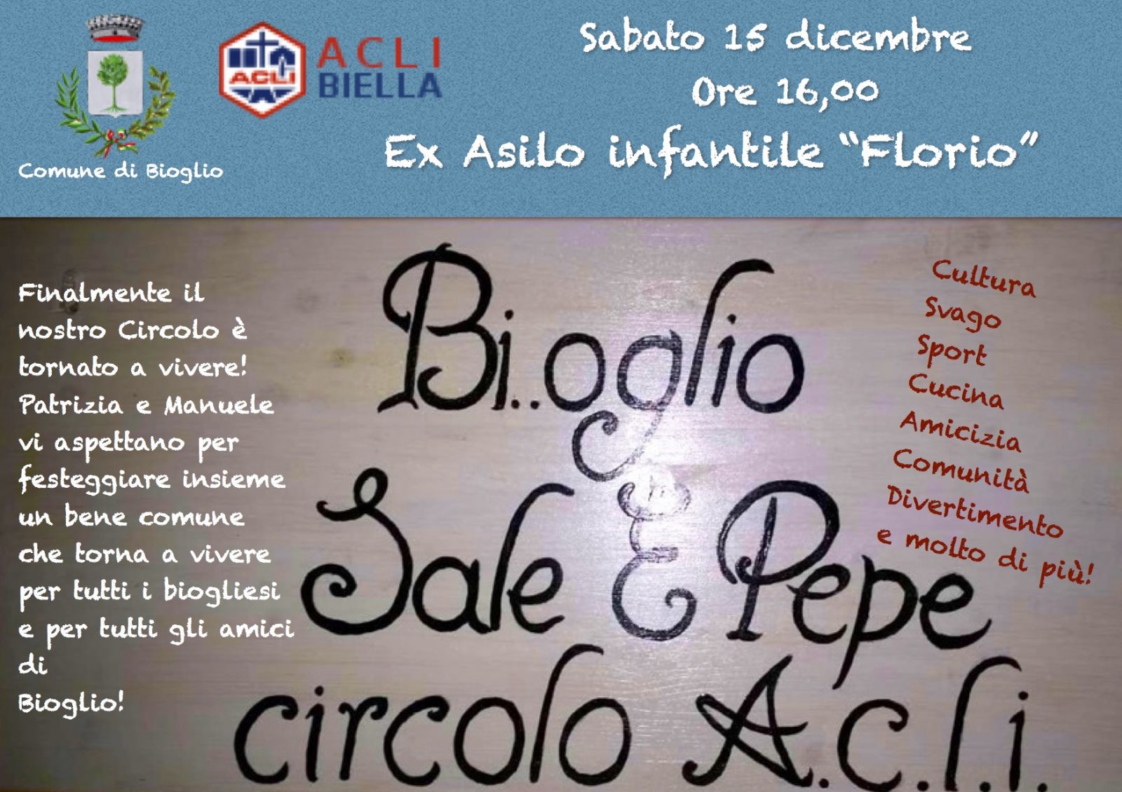 Dopo la grande giornata dell'inaugurazione della "Foresteria di Banchette" ci prepariamo a vivere un altro evento significativo per il nostro paese. Sabato 15 dicembre alle 16,00 presso l'ex Asilo "Florio" inaugureremo il Circolo "Bioglio Sale e Pepe".