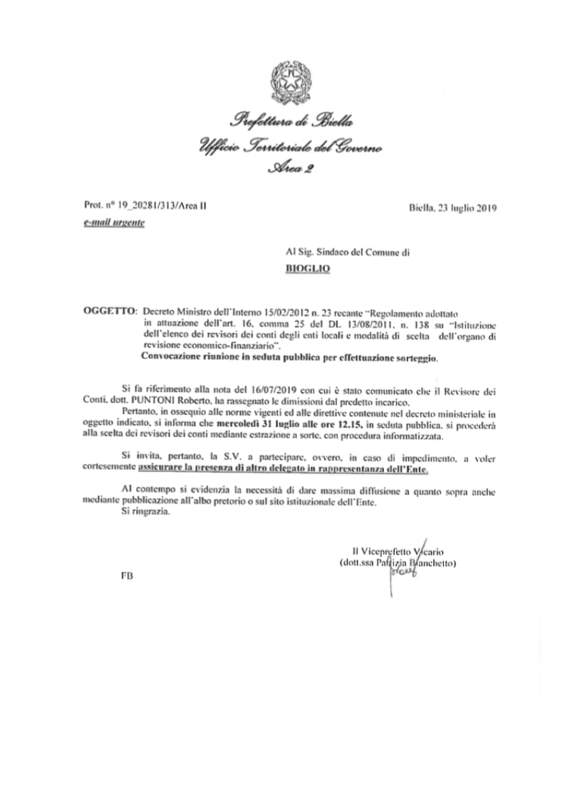 Mercoledì 31 luglio alle ore 12.15 presso il Palazzo del Governo si procederà alla scelta del revisore del conto mediante sorteggio