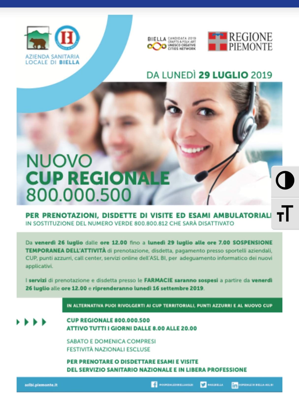si comunica alla cittadinanza che da Venerdì 26 Luglio dalle ore 12:00 fino a Lunedì 29 Luglio alle ore 7:00 ci sarà una sospensione temporanea dell'attività di prenotazione, disdetta, pagamento presso gli sportelli aziendali: CUP, punti azzurri, call center, servizi on-line dell' ASL di Biella, per adeguamento informatico dei nuovi applicativi. si allega locandina dettagliata .