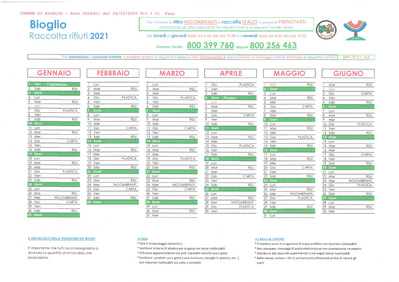 Si allega Calendario raccolta rifiuti nel territorio di Bioglio  del primo semestre dell'anno 2021.