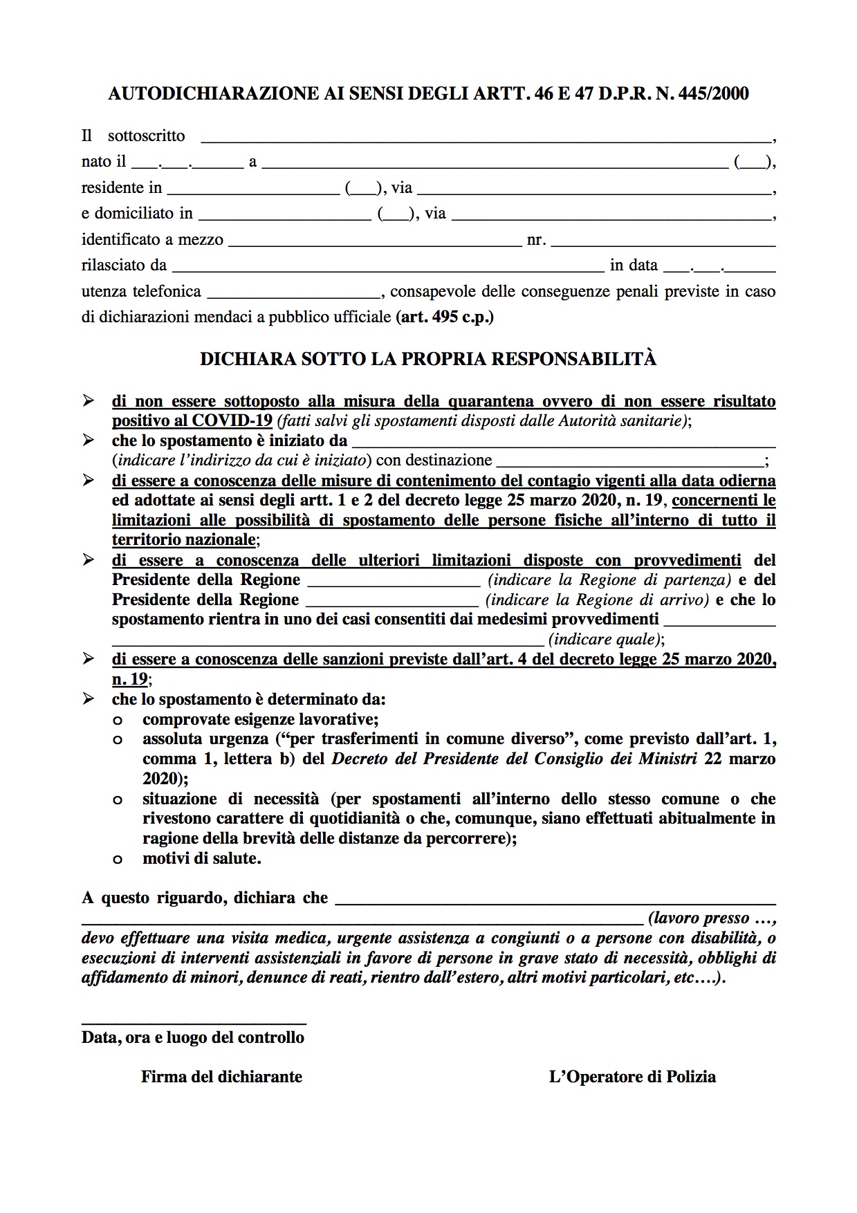 - NUOVO MODELLO AUTOCERTIFICAZIONE SPOSTAMENTI