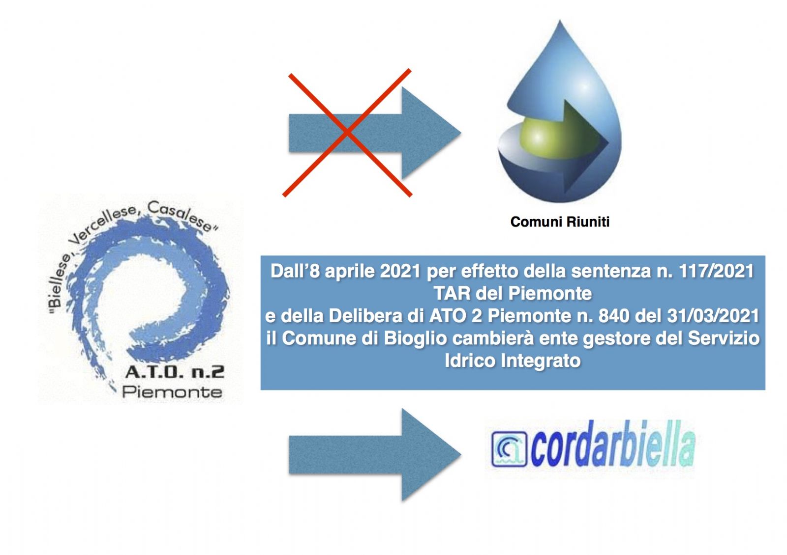 L'Autorità d'Ambito n. 2 del Piemonte durante la Conferenza in Sessione Straordinaria nella seduta del 31 marzo 2021 in ottemperanza alla sentenza n. 117/2021 del TAR del Piemonte con cui il tribunale amministrativo ha respinto il ricorso presentato dalla Società Comuni Riuniti verso la deliberazione 751/2019 con conseguente intervenuta risoluzione della Convenzione 23.04.2008 - rep. 141, con la quale è stata affidata la gestione delle resti del Comune di Bioglio alla società Comuni Riuniti S.r.l. fino alla scadenza del 31.12.2023 e il suo successivo aggiornamento in data 21.07.2017 rep. n. 277 ha disposto il subentro di CORDAR S.p.A. nella gestione del servizio idrico integrato a far data dall'8 aprile 2021. Fino a quella data la gestione delle reti del Comune di Bioglio rimarrà in carico a Comuni Riuniti.