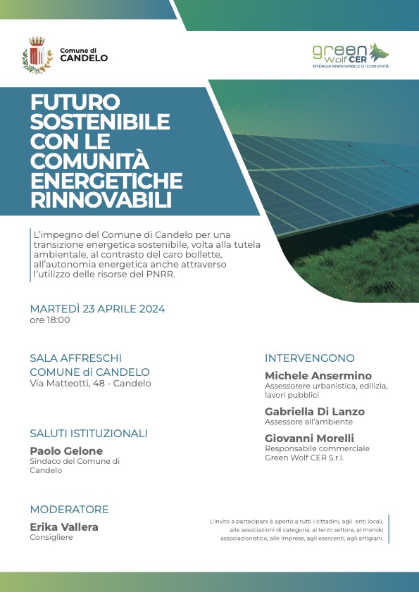 In data 23 aprile 2024 alle ore 18.00, presso la Sala degli Affreschi di Via Matteotti n. 48 a Candelo (centro culturale “Le Rosminiane”) si svolgerà, a cura del Comune di Candelo con la partecipazione del Comune di Bioglio e del Comune di Piatto quali primi Comuni che si aggregheranno al progetto e della Società Promotrice Green Wolf Cer S.r.l., la presentazione ufficiale dello start up della prima Comunità Energetica da Fonti Rinnovabili (CER) della Provincia di Biella.