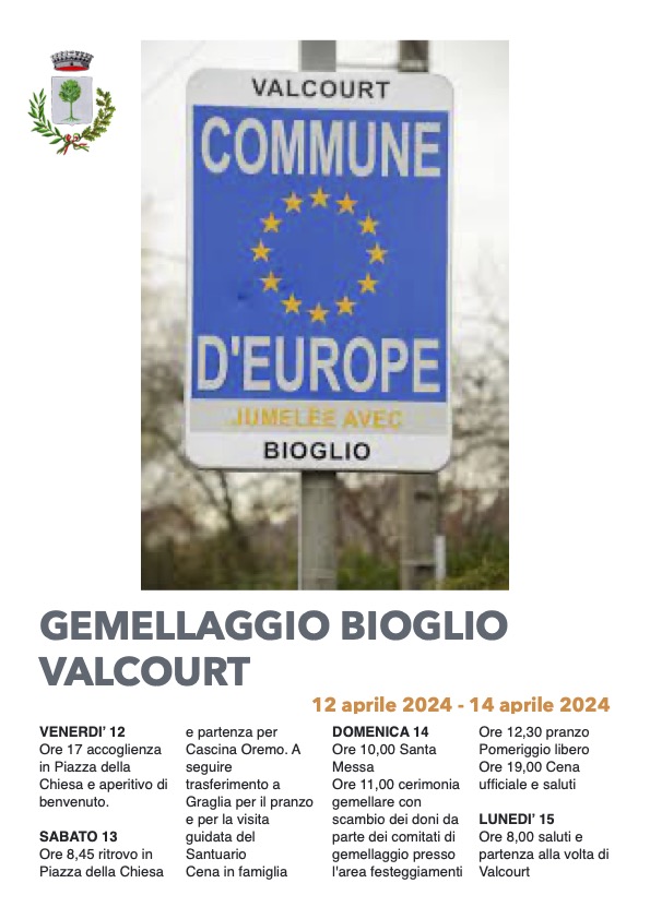 Si rinnoverà tra pochi giorni il nostro gemellaggio. Saranno una cinquantina gli amici di Valcourt che raggiungeranno Bioglio per vivere con noi tre giorni all'insegna dell'amicizia e dell'incontro. Ecco il programma: