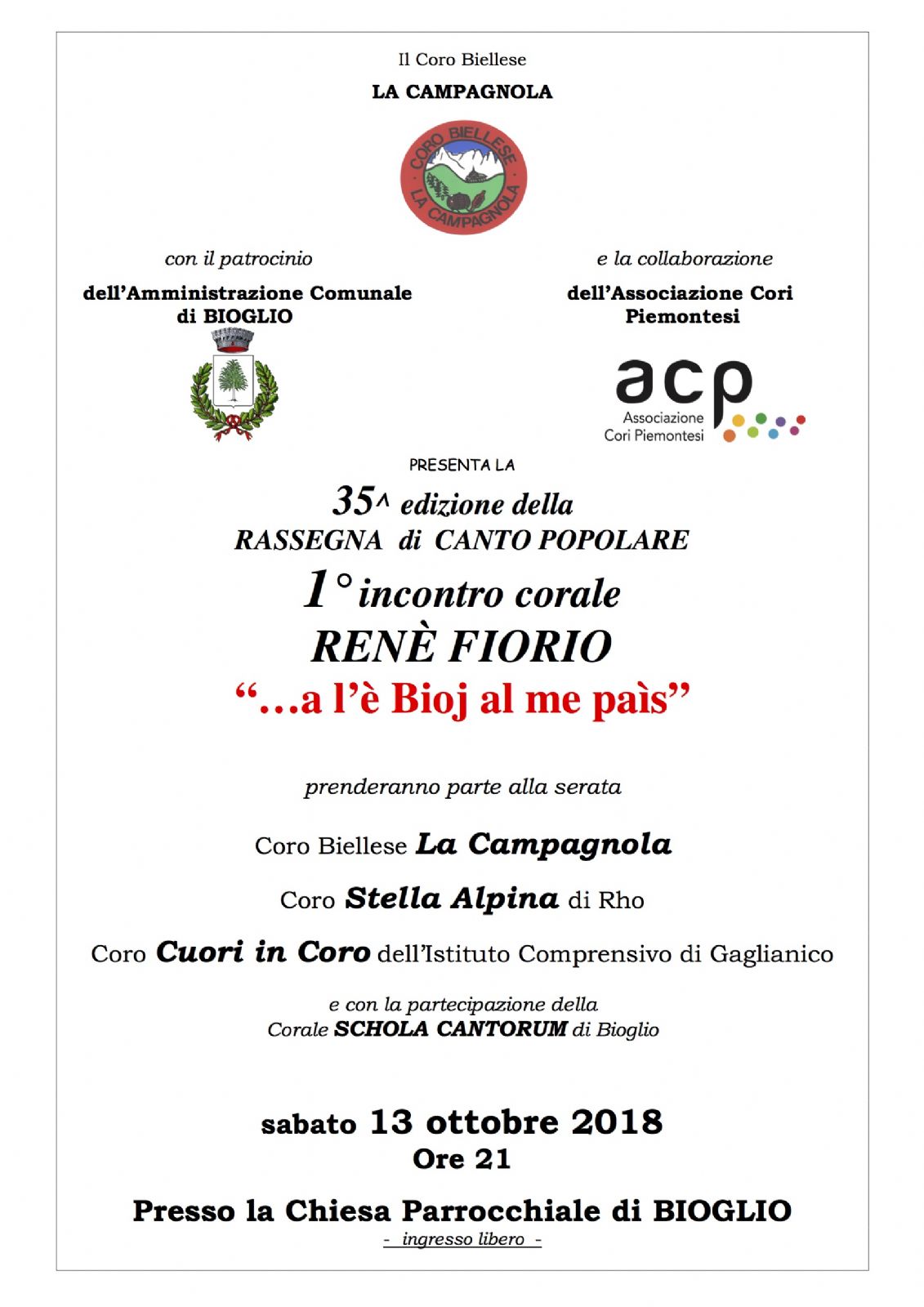 Sabato 13 ottobre alle ore 21,00 presso la Chiesa Parrocchiale di Santa Maria Assunta in Bioglio si terrà la rassegna di Canto Popolare cui parteciperanno: