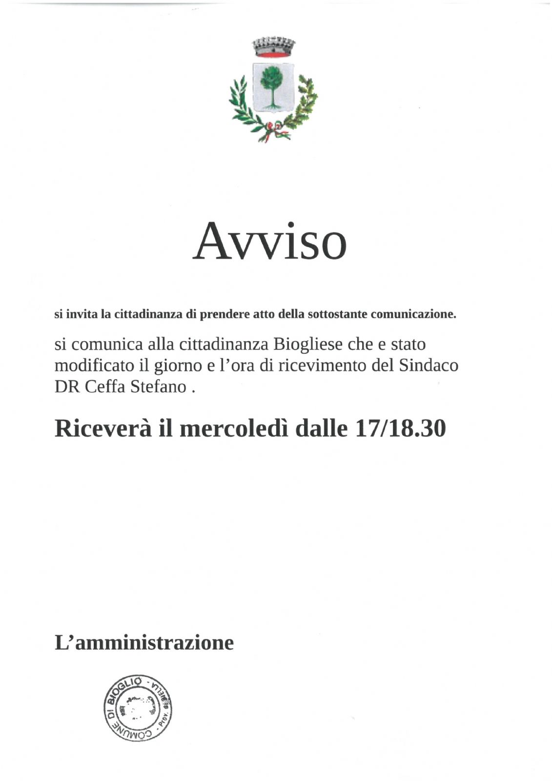 Si comunica alla cittadinanza Biogliese che Il Sindaco ha modificato il giorno di ricevimento pubblico senza appuntamento che sarà il mercoledì dalle 17 alle 18. Negli altri giorni è possibile incontrare il Sindaco richiedendo un appuntamento telefonico. Si suggerisce questa possibilità per evitare lunghe attese che talvolta si verificano durante gli incontri del mercoledì. si allega l'avviso dettagliato.