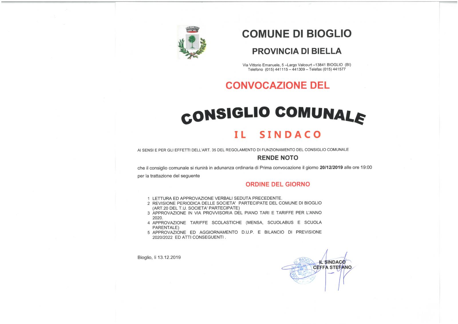 L'Amministrazione Comunale informa i cittadini Biogliesi che il consiglio comunale è convocato il giorno 20 dicembre 2019 PV. ore 19,00 presso la sala consiliare del municipio invitando la cittadinanza alla partecipazione.