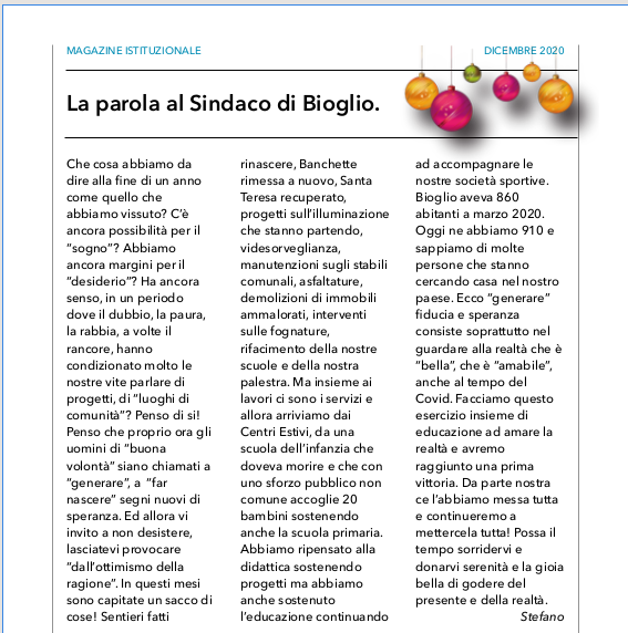 ad accompagnare le nostre società sportive. Bioglio aveva 860 abitanti a marzo 2020. Oggi ne abbiamo 910 e sappiamo di molte persone che stanno cercando casa nel nostro paese. Ecco “generare” fiducia e speranza consiste soprattutto nel guardare alla realtà che è “bella”, che è “amabile”, anche al tempo del Covid. Facciamo questo esercizio insieme di educazione ad amare la realtà e avremo raggiunto una prima vittoria. Da parte nostra ce l’abbiamo messa tutta e continueremo a mettercela tutta! Possa il tempo sorridervi e donarvi serenità e la gioia bella di godere del presente e della realtà.
