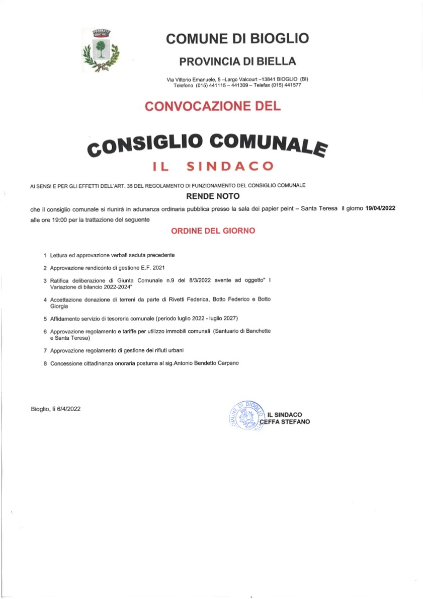 Il giorno 19 aprile 2022 alle ore 19,00 presso la Sala Papier Peint presso l'immobile denominato Santa Tersa è convocato il Consiglio Comunale in sessione ordinaria. In particolare durante la seduta verrà conferita la cittadinanza onoraria ad Antonio Benedetto Carpano, padre del Vermut.