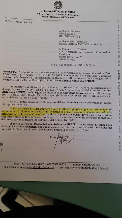 Notizia importante! Da lunedì 16 gennaio prenderà servizio a Bioglio la nuova segretaria comunale Letizia Antonella Spezzi. E' un bellissimo risultato. Da una decina di anni il Comune di Bioglio non ha avuto un segretario titolare. Dopo il Dottor Regis che chiese l'avvicinamento a casa arrivò il Dottor Paracchini che al termine del mandato amministrativo su richiesta dei comuni convenzionati venne sostituito con il Dottor Fontanella il quale a sua volta per prestare servizio su un comune maggiore venne sostituito per un breve periodo dal Dottor Fontanella e di seguito il Dottor Ferrara. Con il pensionamento del Dottor Ferrara il Comune di Bioglio a causa della penuria di Segretari Comunali, funzionari numericamente e inspiegabilmente ridottissimi, il Comune di Bioglio ha avuto solo Segretari "a scavalco" per pochissime ore al giorno. Il Dottor Ingrassia, il Dottor Cammarano, la Dottoressa D'Agostino, il Dottor Esposito, il Dottor Caruso e negli ultimi due anni il Dottor Carenzo.